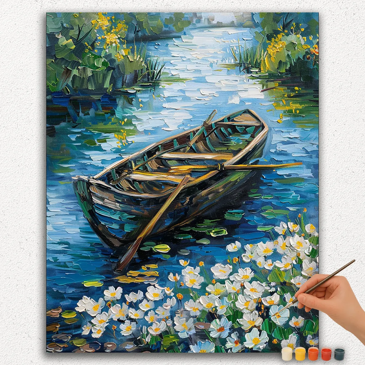 Transformez votre espace avec notre kit de peinture DIY “Beau Bateau et Fleurs Blanches”. Cette scène sereine représente un bateau paisible flottant sur des eaux calmes, entouré de délicates fleurs blanches.