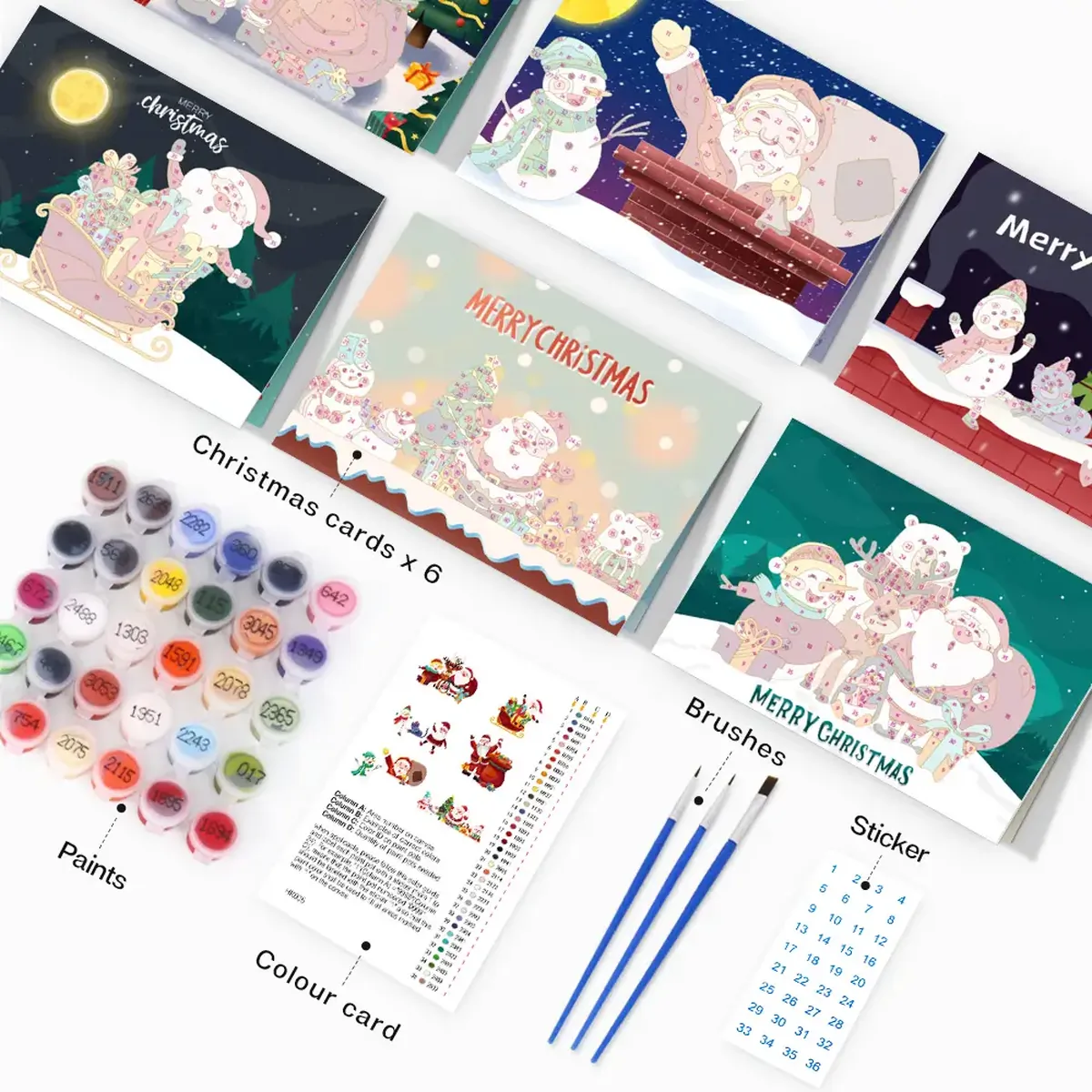 Vous recevrez tous les accessoires nécessaires pour compléter vos cartes de Noël à peindre par numéros. Vous obtiendrez les outils et accessoires suivants :- 6 Cartes de Noël