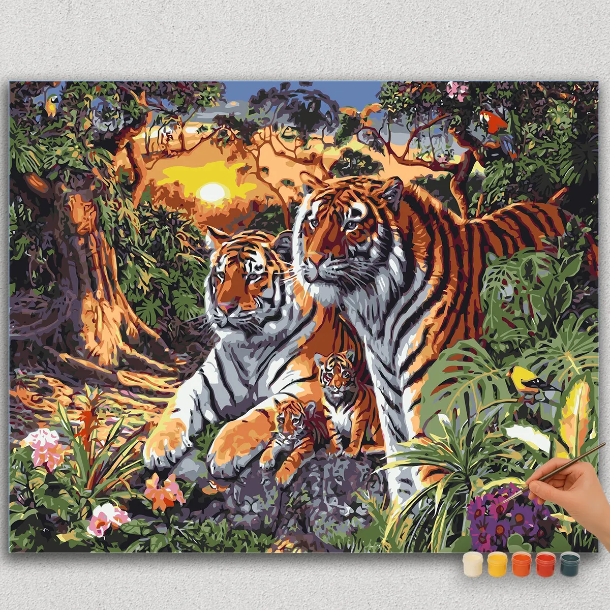 Donnez vie à la majestueuse famille de tigres avec notre kit de peinture DIY. Cet ensemble comprend tout ce dont vous avez besoin pour créer une œuvre d’art époustouflante représentant un parent tigre protecteur avec d’adorables petits dans leur habitat naturel.